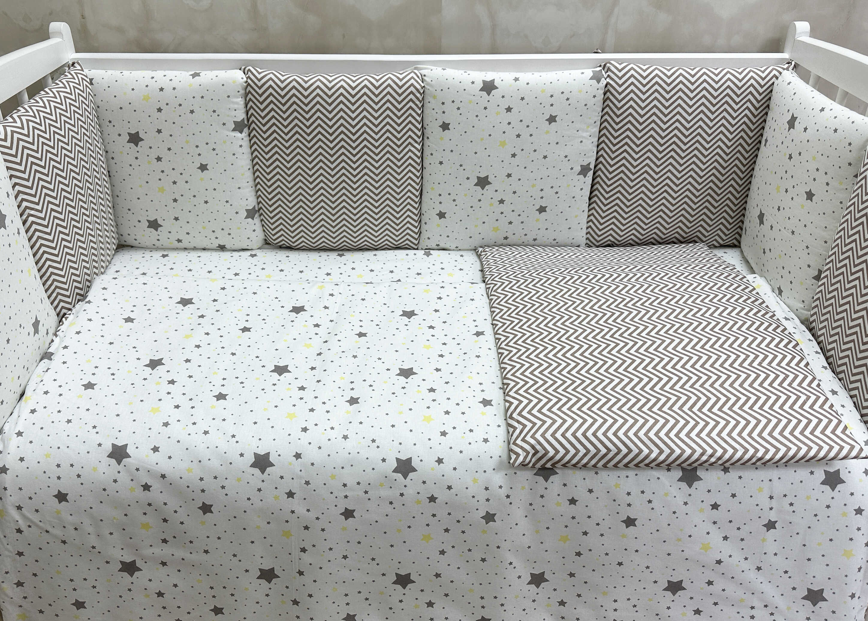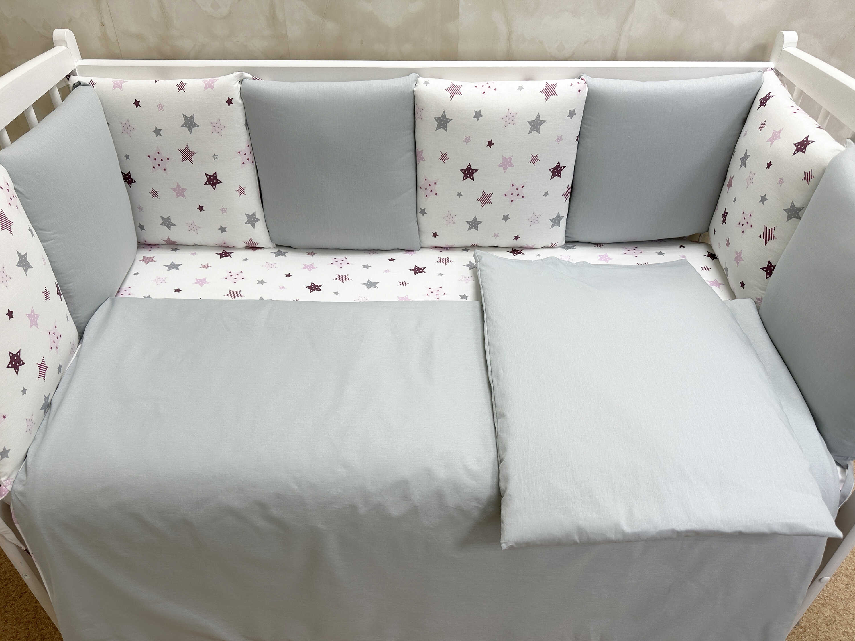 Комплекты в детскую кроватку для новорожденных с бортиками подушечками